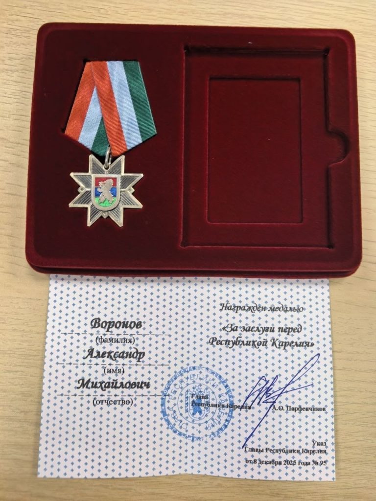 19 декабря 2025 года Глава Республики Карелия Артур Олегович Парфенчиков наградил директора Государственного Училища олимпийского резерва в г. Кондопоге Александра Михайловича Воронова медалью за заслуги перед Республикой Карелия.